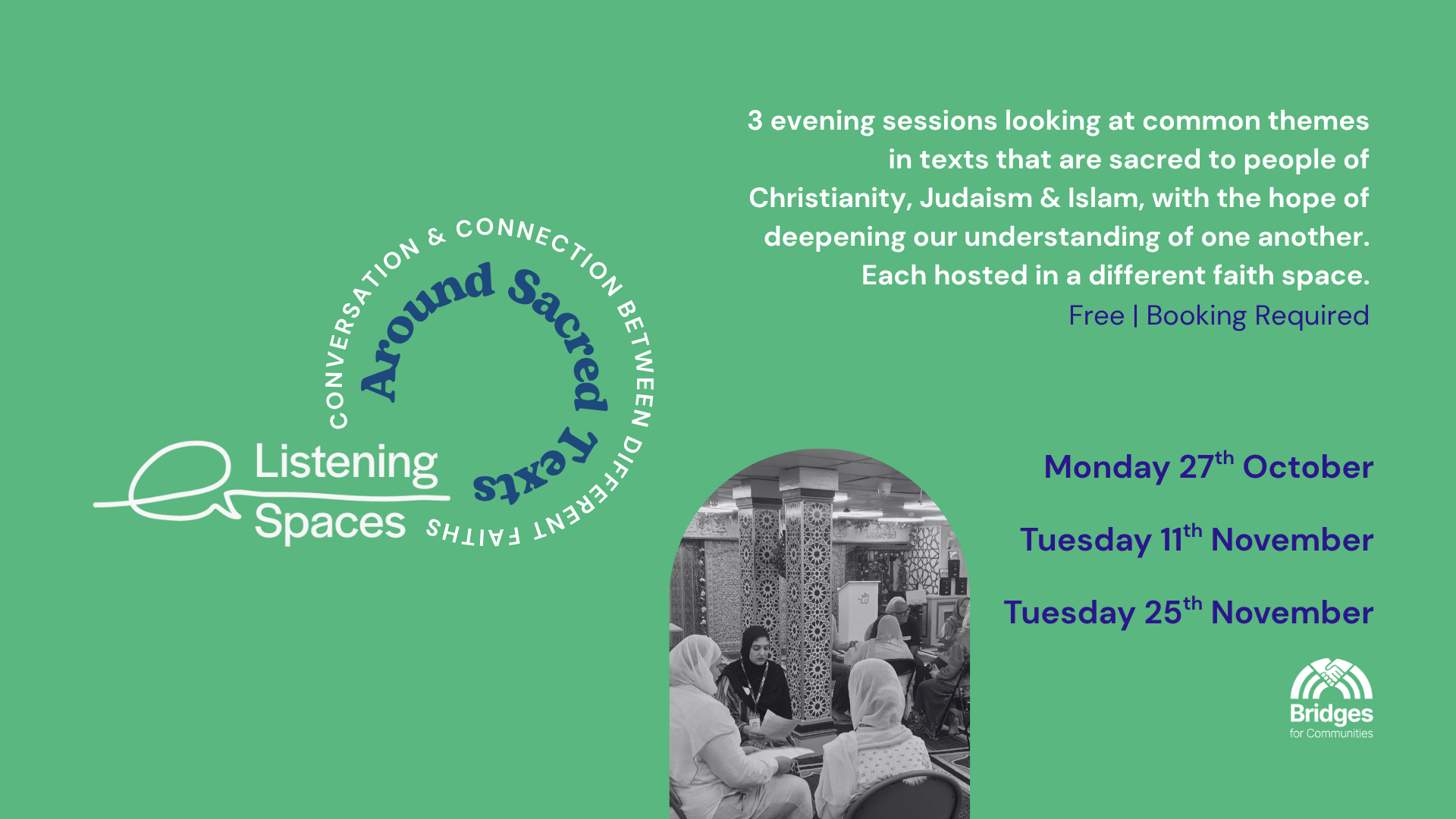 7-9pm Monday 27th October | 7-9pm Tuesday 11th November | 7-9pm Tuesday 25th November  3 sessions looking at common themes in texts that are sacred to people of Christianity, Judaism and Islam, with the hope of deepening our understanding of one another.    How will these events be inclusive and balanced? Each evening will be […]